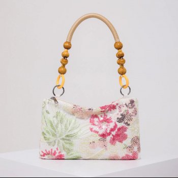 Floral Beaded Sequin Woven Wooden Handle Shoulder Bag for Women